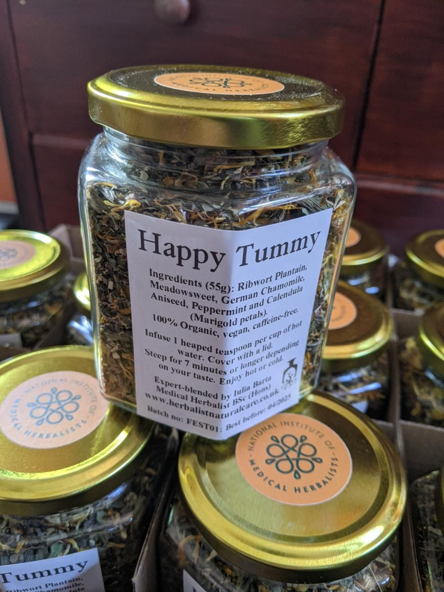 Organic Ribwort Plantain, Meadowsweet, German Chamomile, Aniseed, Calendula petals (Marigold) and a little Peppermint.